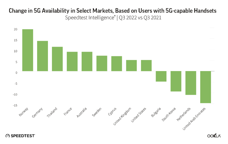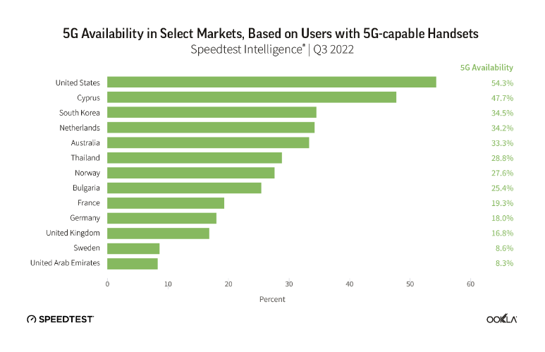 我们研究了 2022 年第三季度 Speedtest Intelligence 的数据,看看 5G 的性能自去年以来有什么变化,哪里的下载速度在国家层面上是最快的,以及卫星技术如何提供额外的连接选择。我们还研究了尚未有 5G 的国家,以了解消费者在哪些地方看到了 4G LTE 接入的改善。