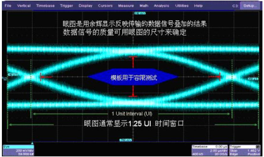 "眼图就是象眼睛一样形状的图形。”眼图是用余辉方式累积叠加显示采集到的串行信号的比特位的结果,叠加后的图形形状看起来和眼睛很像,故名眼图。眼图上通常显示的是1.25UI的时间窗口。眼睛的形状各种各样,眼图的形状也各种各样。通过眼图的形状特点可以快速地判断信号的质量。