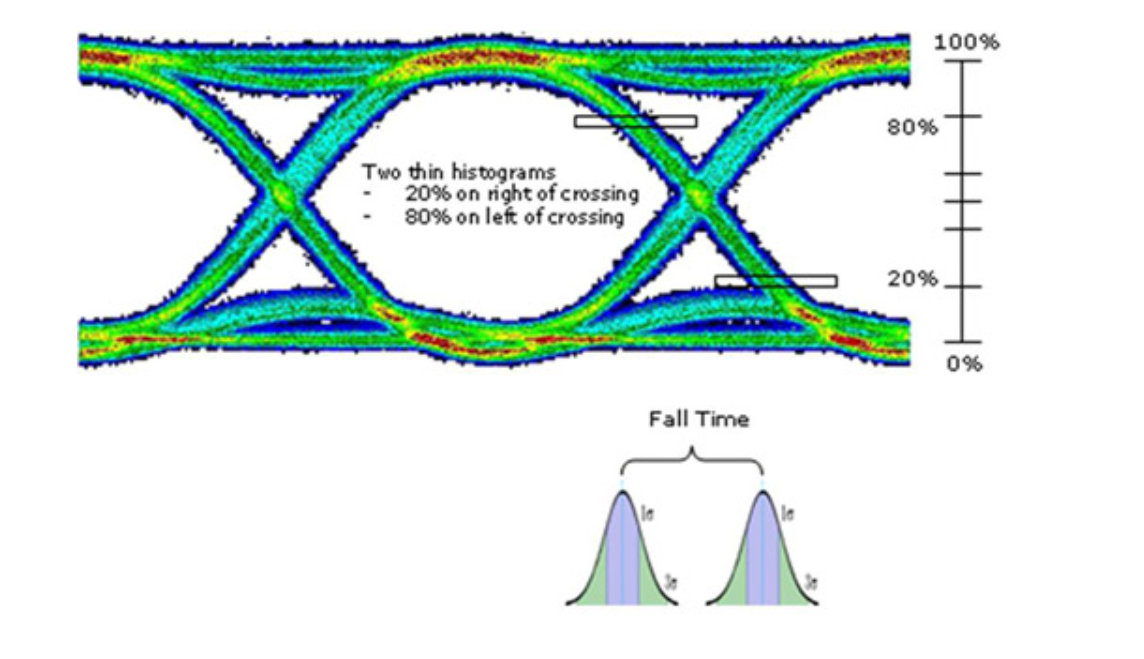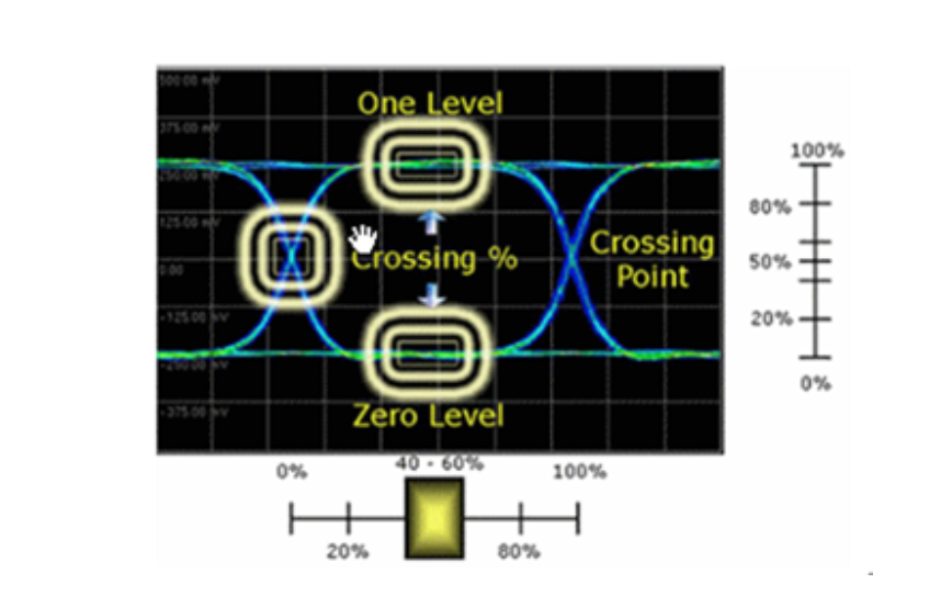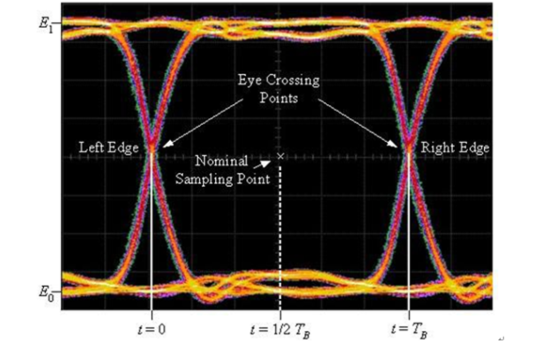 “眼宽”反映信号的总抖动,即是眼图在水平轴所开的大小,其定义为两上缘与下缘交汇的点(Crossing Point)间的时间差。