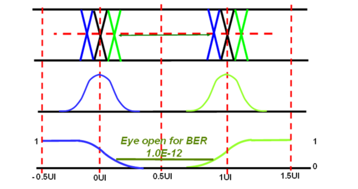 上述两图中,BER图与眼图时间轴相同,两侧与眼图边沿相对应,样点位于中心。BER一定时,曲线之间的距离是该BER上的眼图张开程度。在样点接近交点时,抖动会导致BER提高到最大0.5。