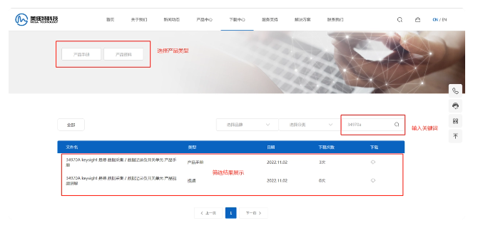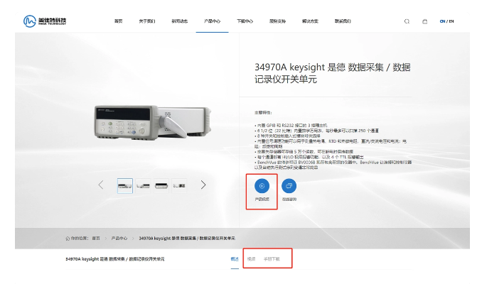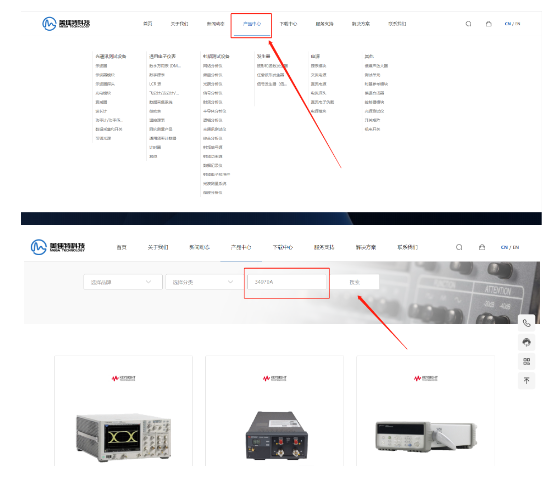 步骤二:点击导航栏上“产品中心”,进入产品中心页面,输入需要查询的产品型号,例:34970A。点击搜索即可