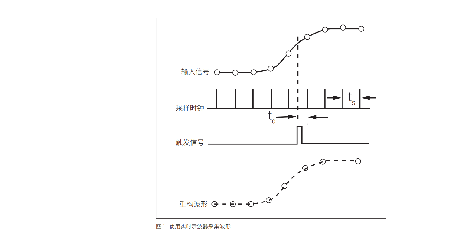 实时示波器可以根据数据本身的特征触发,通常是在输入波形的幅度达到某个阈值 时发生触发。这时,示波器开始将模拟波形异步转换为数字数据样点,转换速率与 输入波形的数据速率无关。该转换速率称为采样率,通常来自内部时钟信号。如图 1 所示,示波器对输入波形的幅度进行采样,将采样值保存到存储器中,然后继续 进行下一次采样。触发器的主要任务是为输入的数据提供一个水平时间参考点。