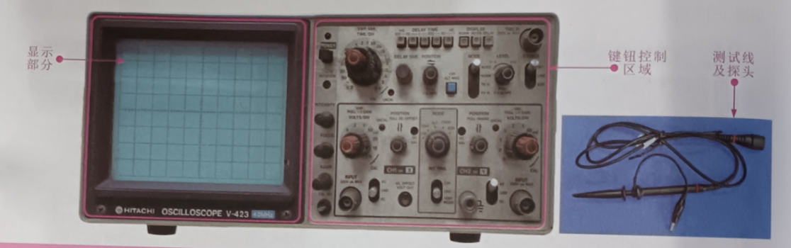 如图所示,典型模拟示波器的整机结构。主要由显示部分、键钮控制区域、测试线及探头、外壳等部分构成。
