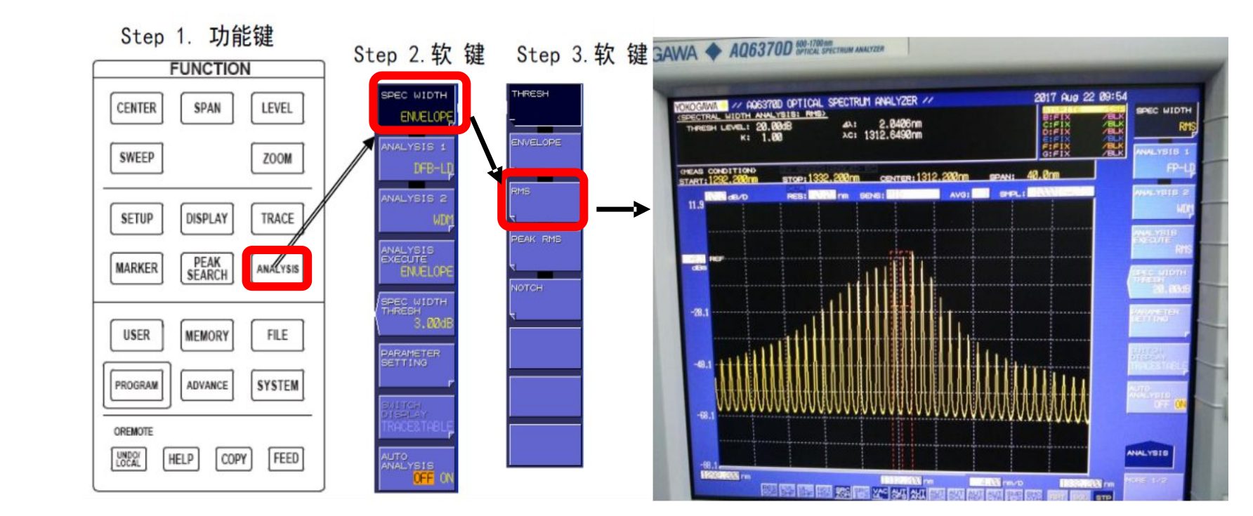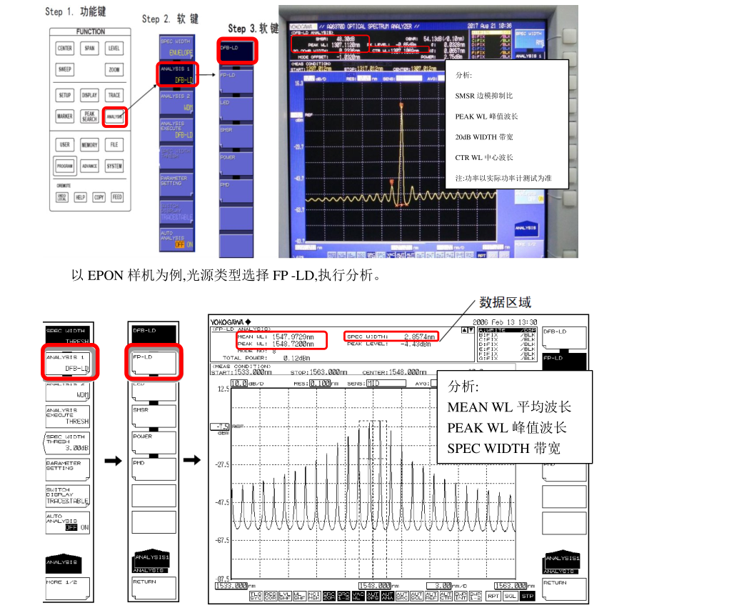 注意:在分析 FP-LD 光源时,数据区域内 SPEC WIDTH 测试得就是 3dB 带宽,与 K 系数有关,当 K=1 时,SPEC