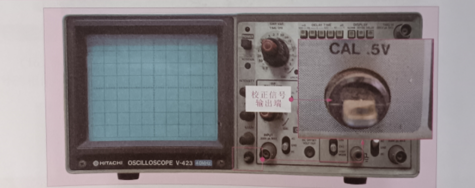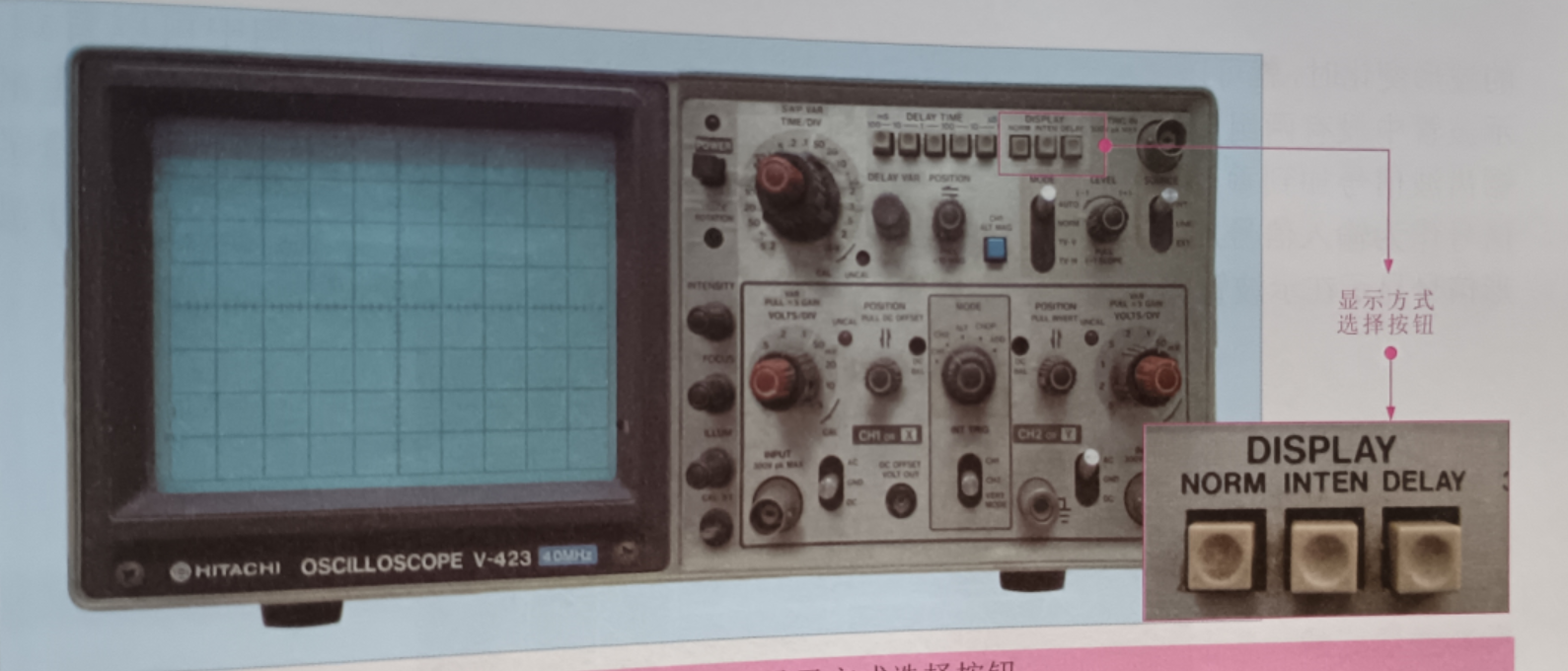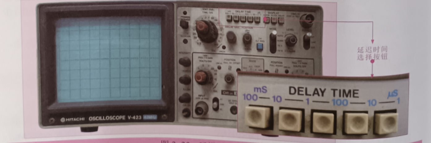 接地端:测量信号波形时要将地线与被测设备的地线连接在一起,扫描线倾斜调整 (TRACE ROTATION): 调整扫描线的水平方向,内触发切换开关(CH1-CH2 VERTMODE):设定内部触发方式,延迟时间选择按钮(DELAYTIME):设置5个延迟时间挡位,如图所示