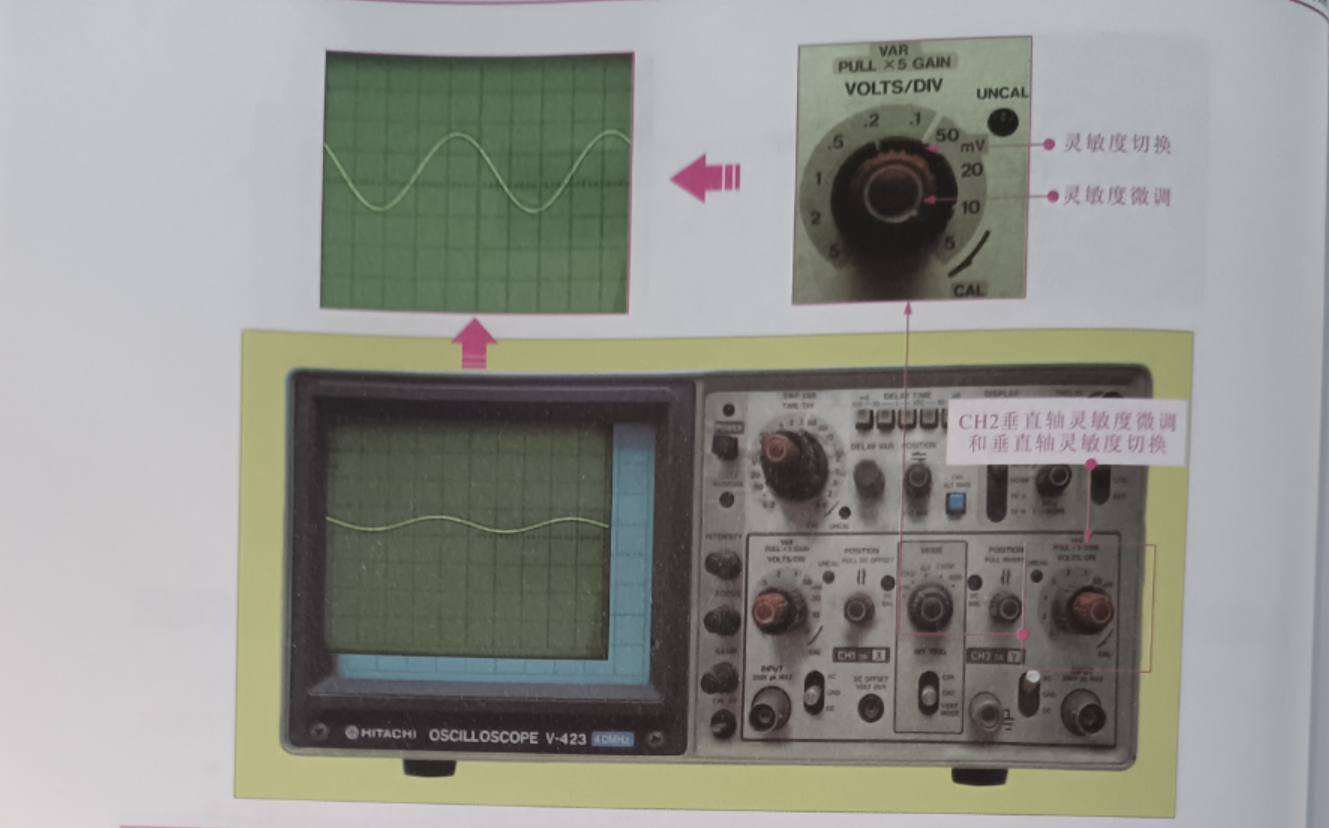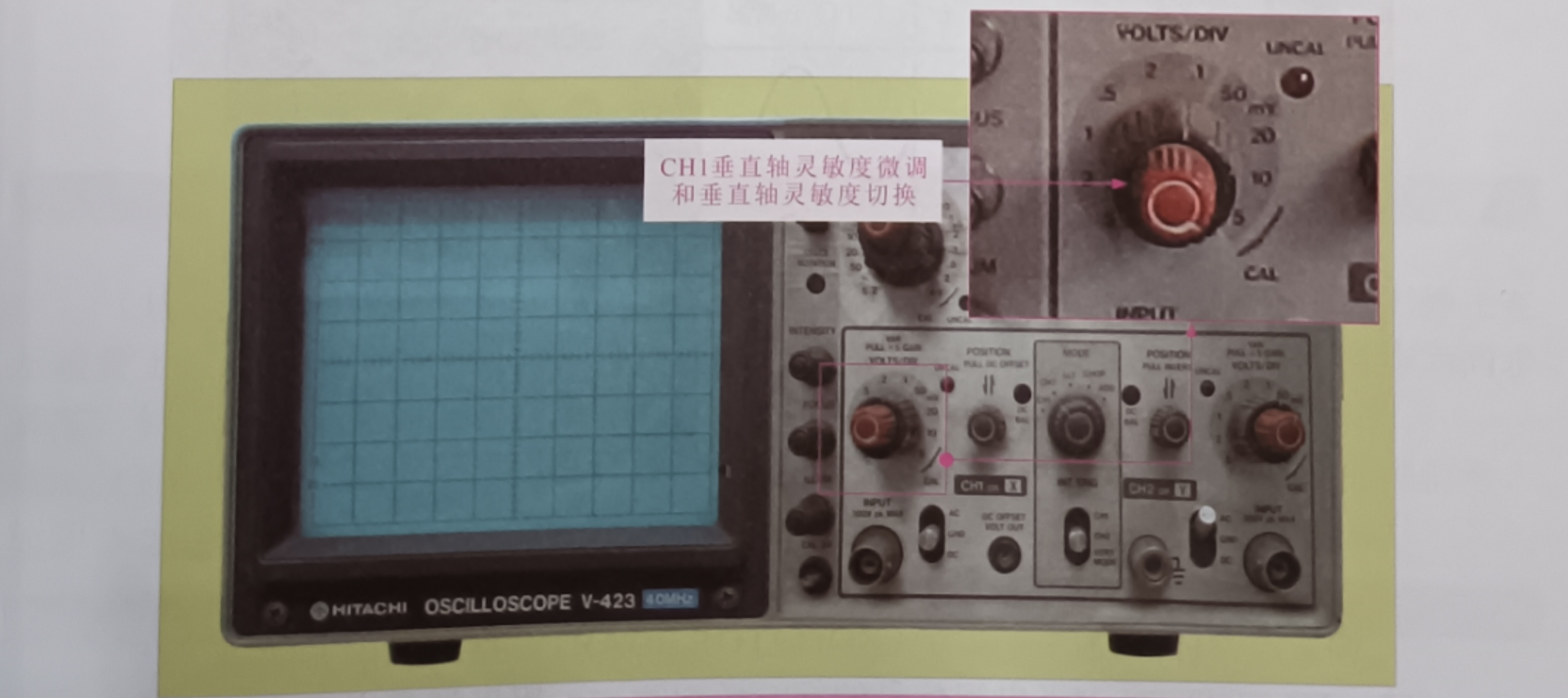 CH1 垂直轴灵敏度微调 (VARIABLE) 和垂直轴灵敏度切换 (VOLTSDIV): 这两个旋钮是一个同心调整旋钮,外圆环形旋钮是灵敏度切换钮,内圆旋钮是微调钮,可以根据被测信号的幅度切换输入电路的衰减量,使显示的波形在示波管上有适当的大小,如图所示。