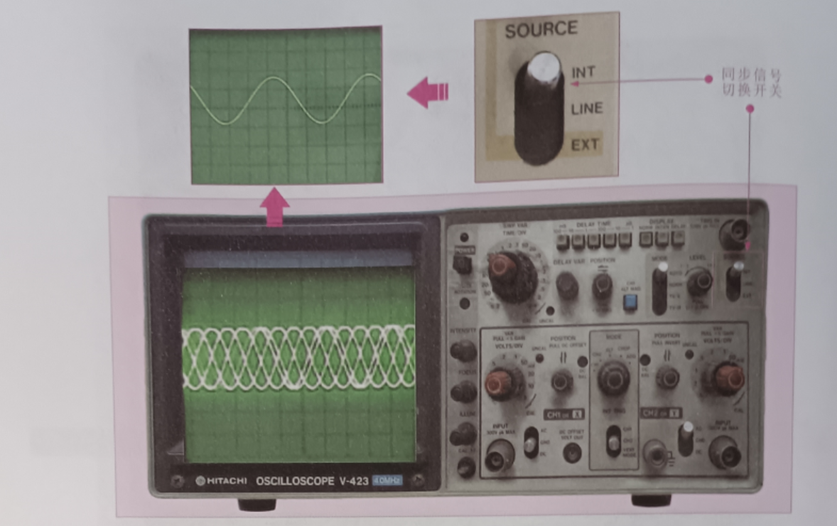 同步(触发)信号切换开关 (TRIG SOURCE): 使观测信号的波形静止在示波管上,INT 为内同步源,LINE 为线路输入信号,EXT 为由外部输入信号作为同步基准,如图所示。