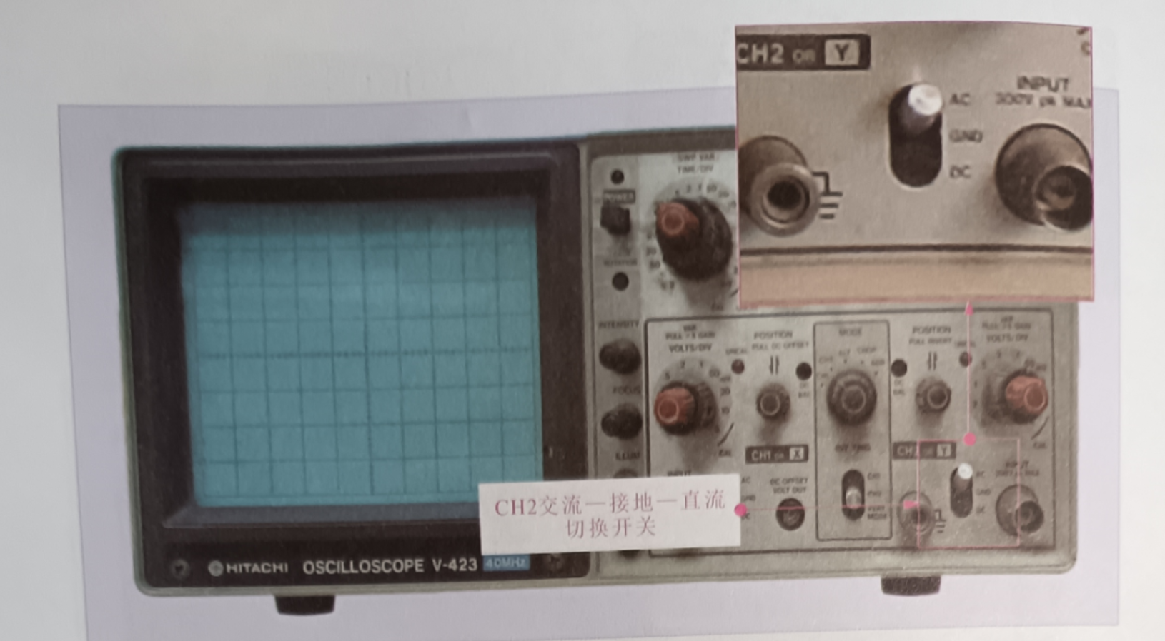 CH2 交流一接地一直流切换开关[(CH-2)AC-GND-DC]: 根据 CH2 信号输入端输入的信号选择不同的挡位,AC 为观测交流信号,DC 为观测直流信号,GND 为观测接地,如图所示