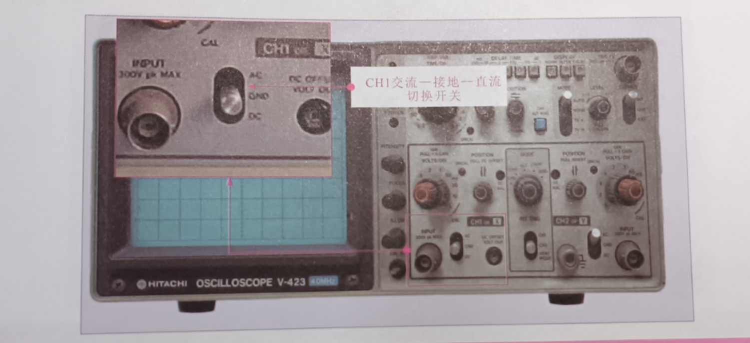 CH1 交流一接地一直流切换开关[(CH-I)AC-GND-DC]: 根据 CH1 信号输入端输入的信号选择不同的挡位,AC 为观测交流信号,DC 为观测直流信号,GND 为观测接地,如图所示。