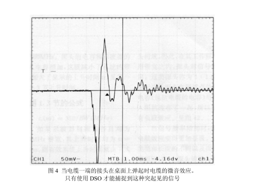 如果某一个事件只发生一次, 那么模拟示波器通常是不能应付的。 而这正是DSO 展示其强大能力的时机, DSO 能够捕捉这种罕见的一次性事件, 并且按照你的的希望长时间地将它显示出来。这种罕见的事件甚至可能是干扰的结果, 通过用干扰本身来触发, DSO 具有显示预触发信息的能力, 包括显示干扰的原因。图 4 显示的是当电缆一端的开路接在桌面上弹起时电缆的微音效应波形, 图中触发时刻用 Δ 符号来表示, 这个符号左边的波形信息就是预触发信息。