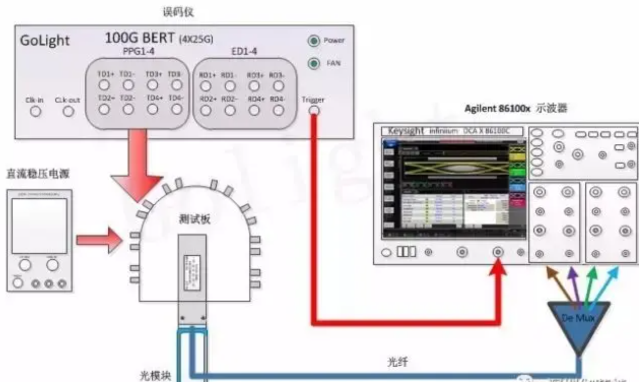 光模块发射端性能指标基本上可以用发射端的光眼图信息来表征。如图所示,待测光模块结合测试板将误码仪提供的高速电信号转换成光信号,通过光纤跳线接入光示波器中,同时误码仪的Trigger端将同步时钟信号接入示波器,实现信号同步,在光示波器上形成眼图。