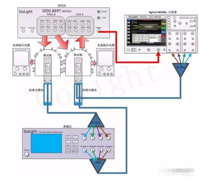 光模块厂商一般将发射和接收端分别测试完的光模块进行老化后再次进行模块参数的检测,以确定光模块因老化而引起功能参数的变化。对模块的测试在如上图的测试方案中,能同时完成灵敏度和眼图光学指标的测量,在实际测试中可能需要两台误码仪来分别驱动两块测试板,要想只用一台误码仪的两路差分输出分别驱动两块测试板,需要选择高质量码型发生器(PPG)。