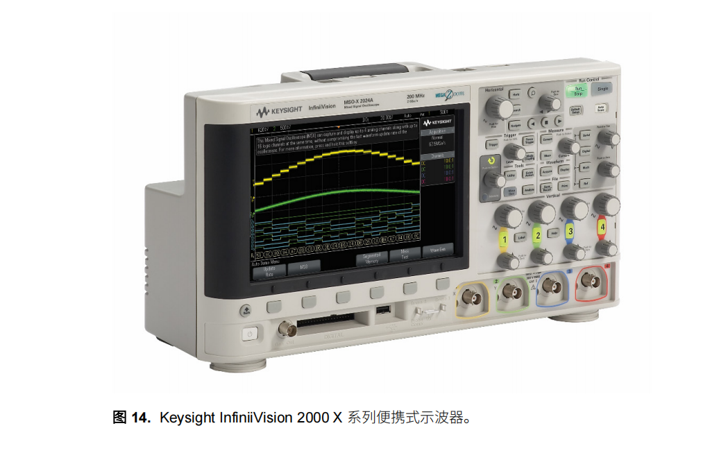 顾名思义,便携式示波器是一种小到可以随身携带的示波器。 如果您需要将示波器带到多个地方,或者在 实验室里从一个工作台移动到另一个工作台,那么便携式示波器可能非常适合您。 图 14 所示的便是一台便 携式示波器 — Keysight InfiniiVision X 系列示波器。 便携式示波器的优点是重量轻、便于携带、开关机速度快,并且易于使用。 它们的性能往往低于大型示波 器,但 Keysight InfiniiVision 1000、2000 和 3000T X 系列示波器的出现,正在改变这一点。 这些示波器具 有便携式示波器常见的所有便携性和易用性特点,功能也足够强大,带宽高达 6GHz,可以应对当今的大多 数调试需求