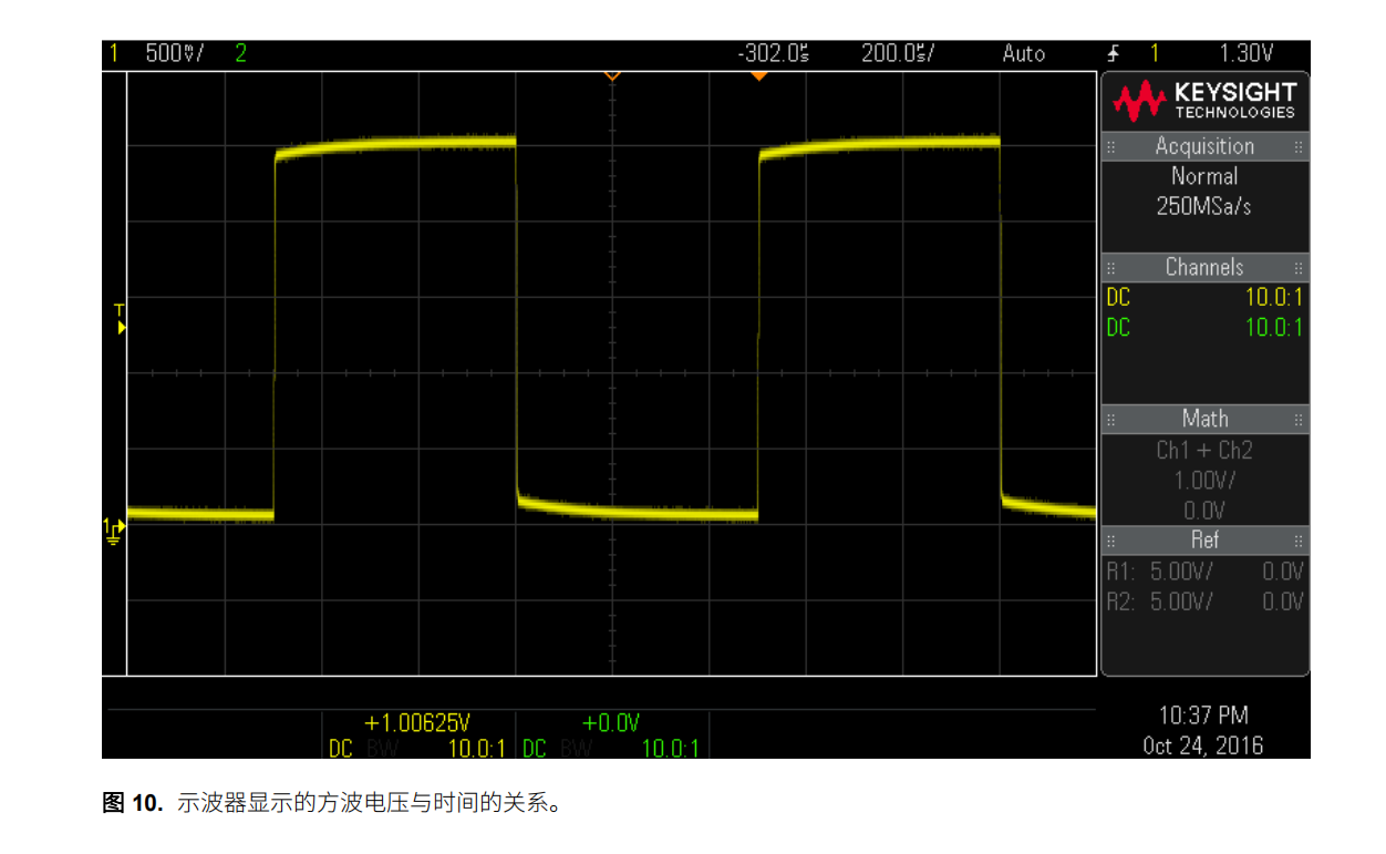 示波器是一种用于将某个变量显示为另一变量的函数的测试与测量仪表。 例如,它可以在显示屏上绘制电 压(y 轴)与时间(x 轴)的关系图。 图 10 就是这样一个关系图示例。 如果您想测试某个电子元件是否工 作正常,这就非常有用。 如果您知道在撤出该元件后信号波形应有的样子,则可以使用示波器来查看该元 件是否确实输出了正确的信号。 请注意,x 轴和 y 轴被网格分成了多个部分。 尽管对于现代示波器而言, 大多数测量都可以通过示波器自动执行,而且结果更加准确,但网格让您能够通过目测估计进行测量。 示波器不仅可以绘制电压与时间的关系图,还具有更多功能。