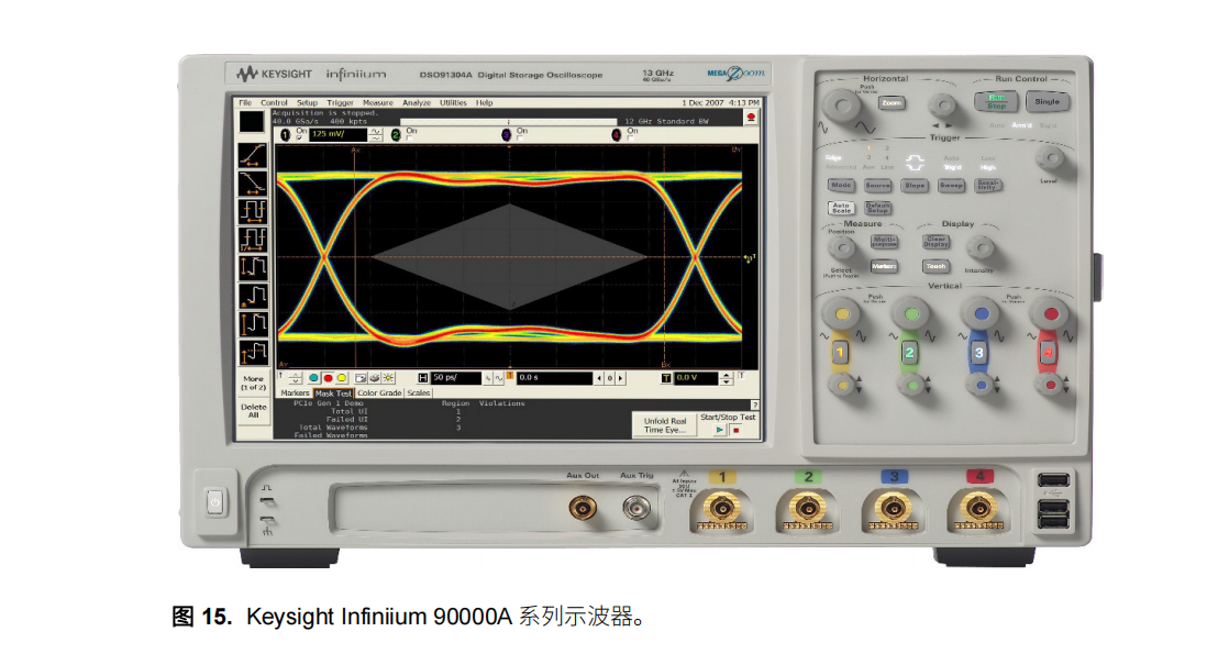 高性能示波器可提供目前最优异的性能。 对于需要带宽高、采样和更新速率快、存储器深度大和测量功能 多的示波器的用户来说,高性能示波器是最佳选择。 图 15 所示的便是一台高性能示波器 — Keysight Infiniium 90000A 系列示波器。 高性能示波器的主要优点是,让您能够正确分析各种信号,并提供了许多应用程序和工具,可以更简单、 更快速地分析当前技术。 其主要缺点是价格高,体积大。