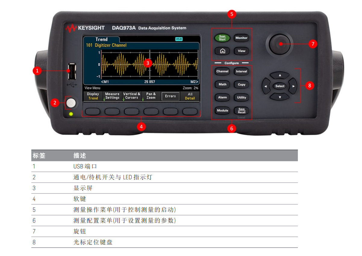 • 简单易用的操作界面:DAQ970A 数据采集系统拥有一个 4.3 英寸的大型彩色显示屏,可以清晰地显示数据和状态。系统还具有一个直观的图形前面板,包括面向任务的自引导菜单,可以方便地进行系统设置、通道配置、扫描控制、数据查看等操作。系统还支持 U 盘,可以轻松地在独立应用软件中复制和记录数据。