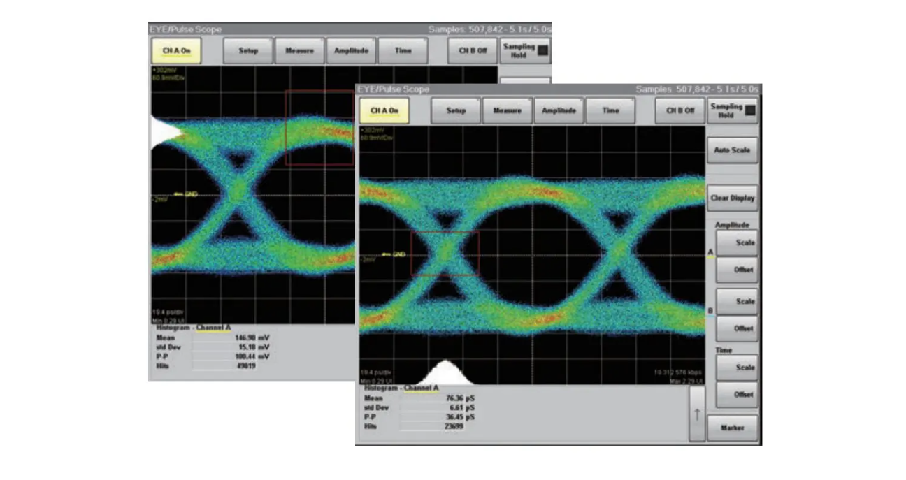 MP2100B内置一项新的标准功能一快速采样模式。除了提供与旧款产品相同的高速100k样本/秒的采样速度以外,新的快速采样模式将采样速度提高到150k样本/秒,是传统眼图分析速度的1.5倍。