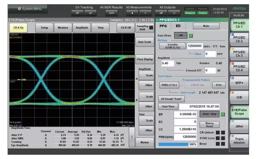 MP2100 B使用BERT通道排名功能来支持高达4通道的批量设置和测量,还内置了可批量捕获测量结果的标准功能,极大地缩短了40 GbE(10 Gbit/s×4)QSFP+ BER的测量时间。此外,它能够在约10ms的时间里捕获BER测量结果,这也减少了测量时间。