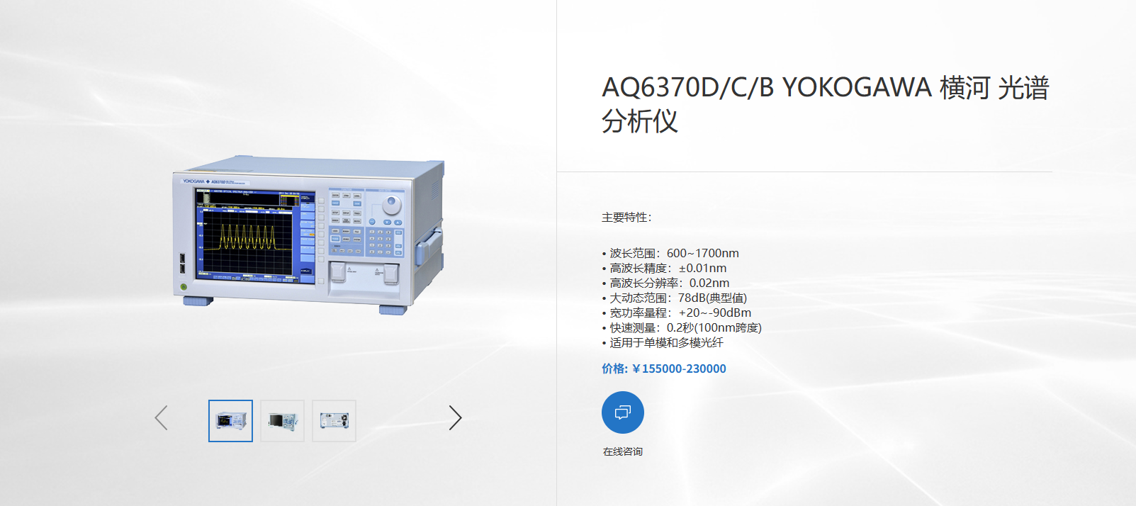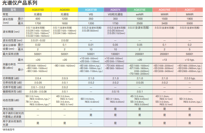 AQ6370D有标准或高性能版本。它的波长分辨率设置为0.02纳米至2纳米,波长精度为0.02纳米(C+L波段),最大水平灵敏度为-90 dBm。高性能型号的近场动态范围为70 dB(峰值1 nm,分辨率0.05 nm)至50 dB(峰值0.1 nm,分辨率0.02 nm)。杂散光抑制比大于或等于70 dB,扫描时间小于0.2秒。对于100纳米波长范围。