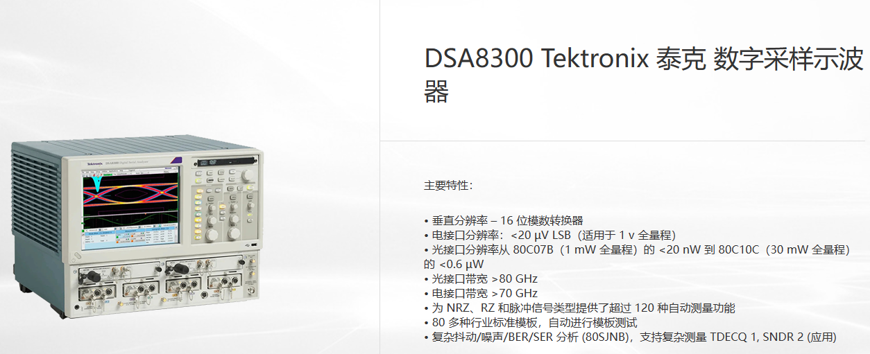 Tektronix DSA8300数字串行分析仪采样示波器是一款高性能的仪器,可以用来测试和分析高速光信号和电信号,支持多种光接口标准和应用。