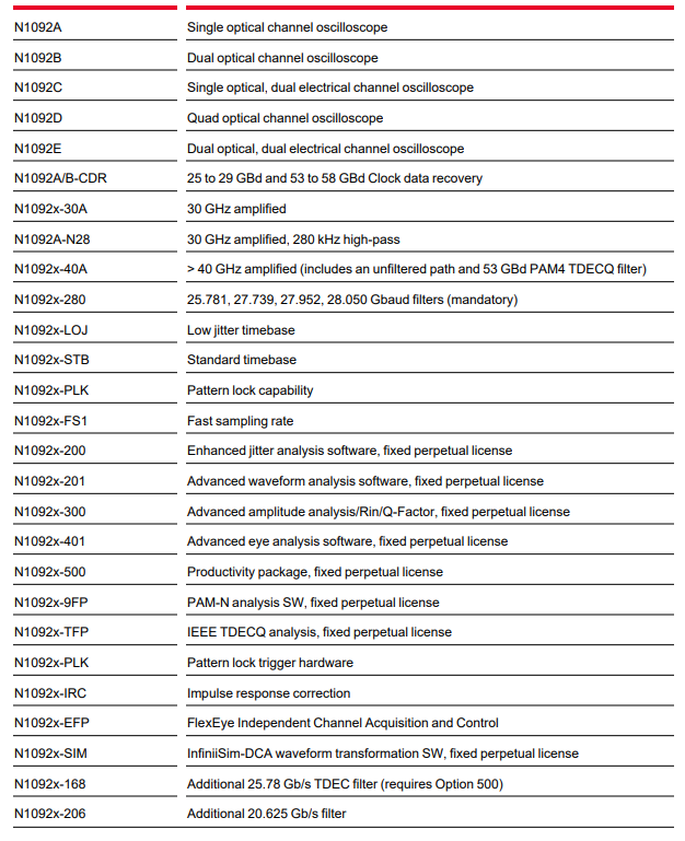• N1092A:一款 DCA-M 采样示波器,配有一个光通道和两个电通道。N1092A 适用于验证光发射机是否符合通信标准。光通道带宽为 40 GHz(选件 40A)、电通道带宽为 30 GHz。