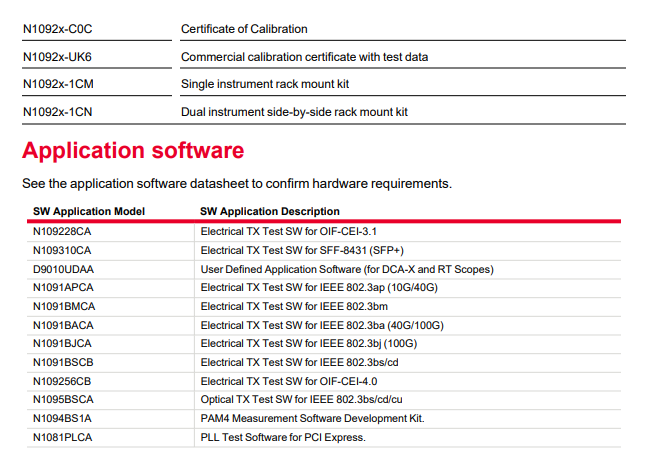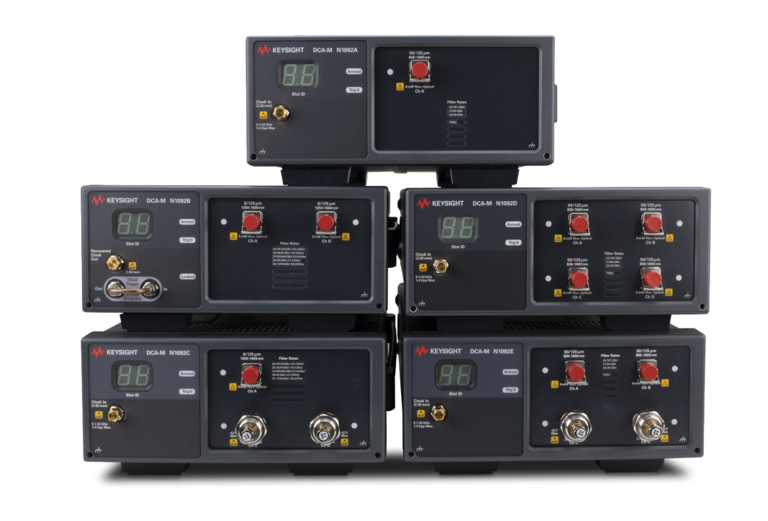 • N1092B:一款 DCA-M 采样示波器,配有一个光通道和两个电通道。N1092B 适用于验证光发射机是否符合通信标准。光通道带宽为 40 GHz(选件 40A)、电通道带宽为 50 GHz。