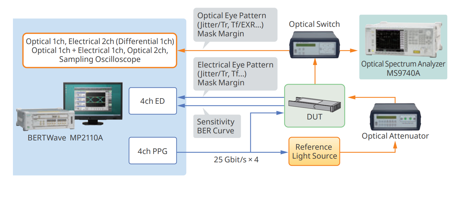 随着网络服务提供商推出各种新型应用,数据量呈指数增长,100G 光模块得到大量应用, 为了提高生产效率,节约成本,光模块制造商正努力寻找价格便宜但可扩展的测试仪器, 能够支持从 10G 向 25G 或更高速率的平滑升级。 BERTWave MP2110A 针对 100 GbE/25 GbE 光学模块生产应用设计,将 BERT(误码率 测试)和采样示波器(眼图模式分析)集成于一体化机箱中。既可提高光模块的生产效率, 也有助于降低生产成本。
