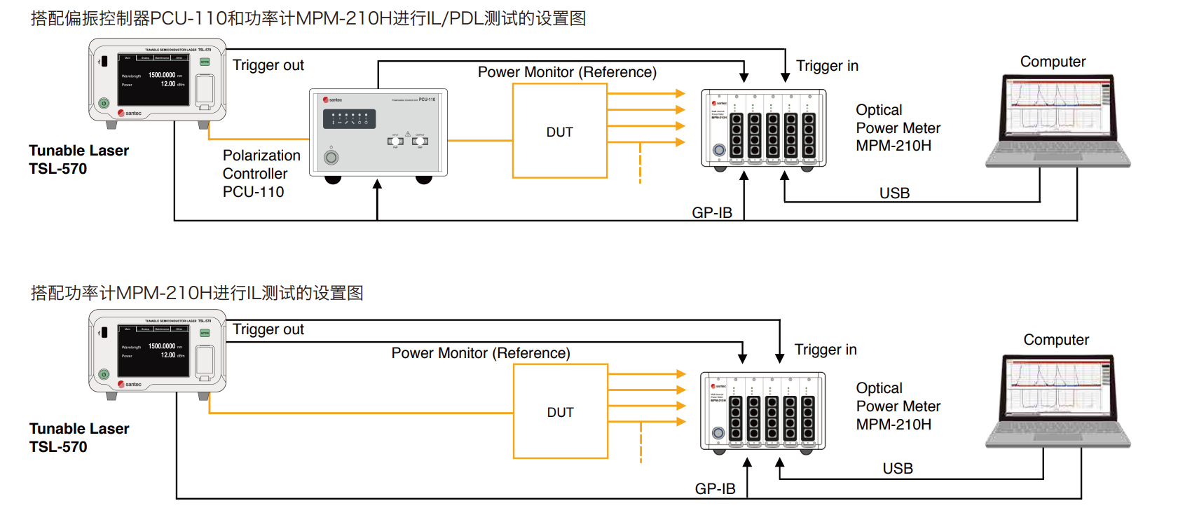Santec扫描测试系统旨在简化光子测试,并提供完整的解决方案,其中高速分析,高分辨率和高准确性等指标是关键。Santec的可调谐激光器(TSL-770、TSL-570等)搭配光功率计(MPM-210H)、偏振控制器(PCU-110)及定制版软件组成完整的扫描测试系统并且优化了WDL和PDL测量,适用于研发和生产环境。该系统采用实时参考,可同时获取可调谐激光器的输出功率和通过DUT传输的光功率,利用穆勒矩阵法提供更高精度的WDL和PDL分析。在保持测量完整性的同时,通过重采样和调整算法来最大化提升测试数据吞吐量。Santec的MPM-210H功率计主机也可与4通道电流计模块MPM-213结合使用。扫描测试系统与MPM-210H/MPM-213的相结合,适用于测试光纤组件的性能,例如收发器的光电二极管(ROSA/Coherent receiver等)或光信道监测。