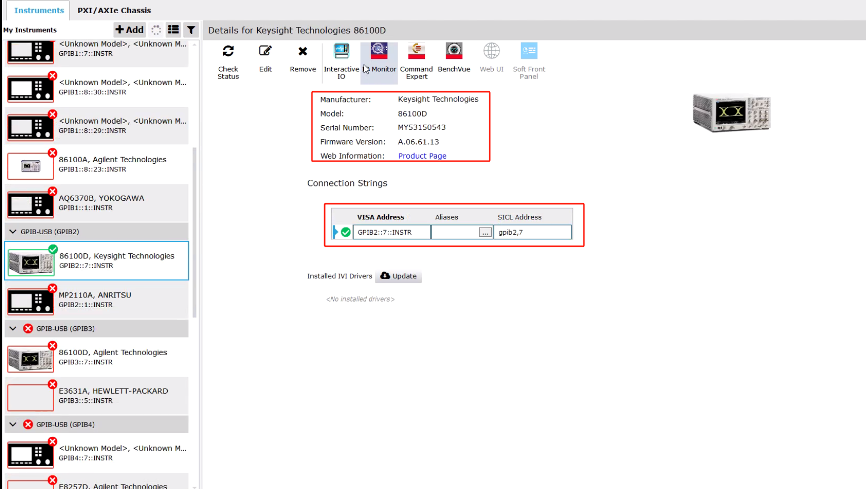 • GPIB驱动程序和转换器:如果您使用GPIB连接86100D,您需要安装相应的GPIB驱动程序和转换器,以便计算机识别GPIB卡或设备。