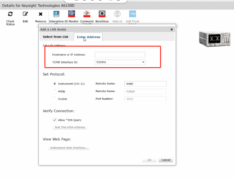 • LAN连接:可以使用网线将86100D的LAN端口连接到计算机的网卡或路由器。需要在86100D和计算机上设置合适的IP地址和子网掩码,以便进行通信。可以使用FlexDCA软件或其他支持VISA的软件,通过LAN向86100D发送SCPI命令。