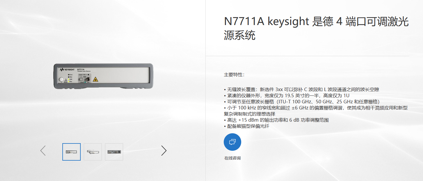 Keysight N7711A 和 N7714A 可调激光源分别配有单个端口和四个端口,提供 C 波段或 L 波段两种波长范围。 它们具有窄线宽,偏置栅格可以微调,是用于测试最新发射系统实际负载性能的理想激光源。 与所有其他是德科技可调激光源一样,所有型号均可达到其指定波长范围内的任意波长点。 在这种模式下,它们能够与基于是德科技全尺寸和紧凑型系列可调激光源的现有测试系统实现代码兼容,这样无疑为客户提供了很大的便利并节省了不小的开支。 在加载了应用软件的系统中,最好通过改变通道指数对激光源(例如系统发射机)进行栅格调谐。 通道栅格可调节至标准的 ITU-T 栅格(间距 50 GHz 等),也可调节至任意栅格。 选定栅格的零频率(基础通道)同样可以调节。 12 GHz 微调范围允许解谐频率。