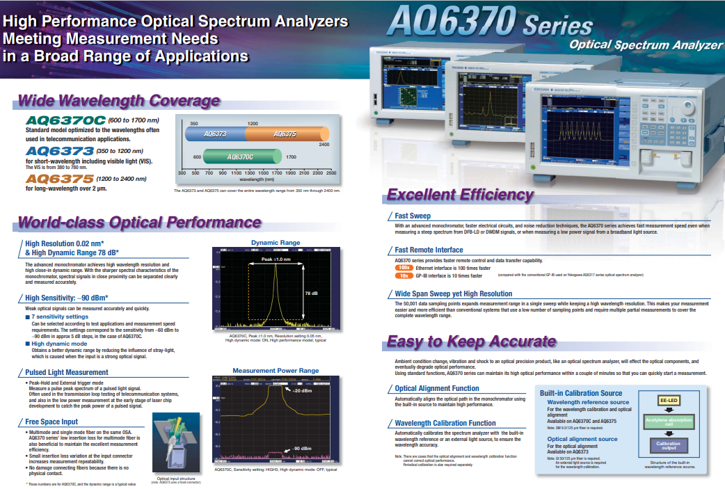 AQ6370C可以用于光有源器件、光无源器件、光传输设备等的测试和研发,AQ6370C是一款光谱分析仪,由横河计量仪表公司生产,于2014年停产: