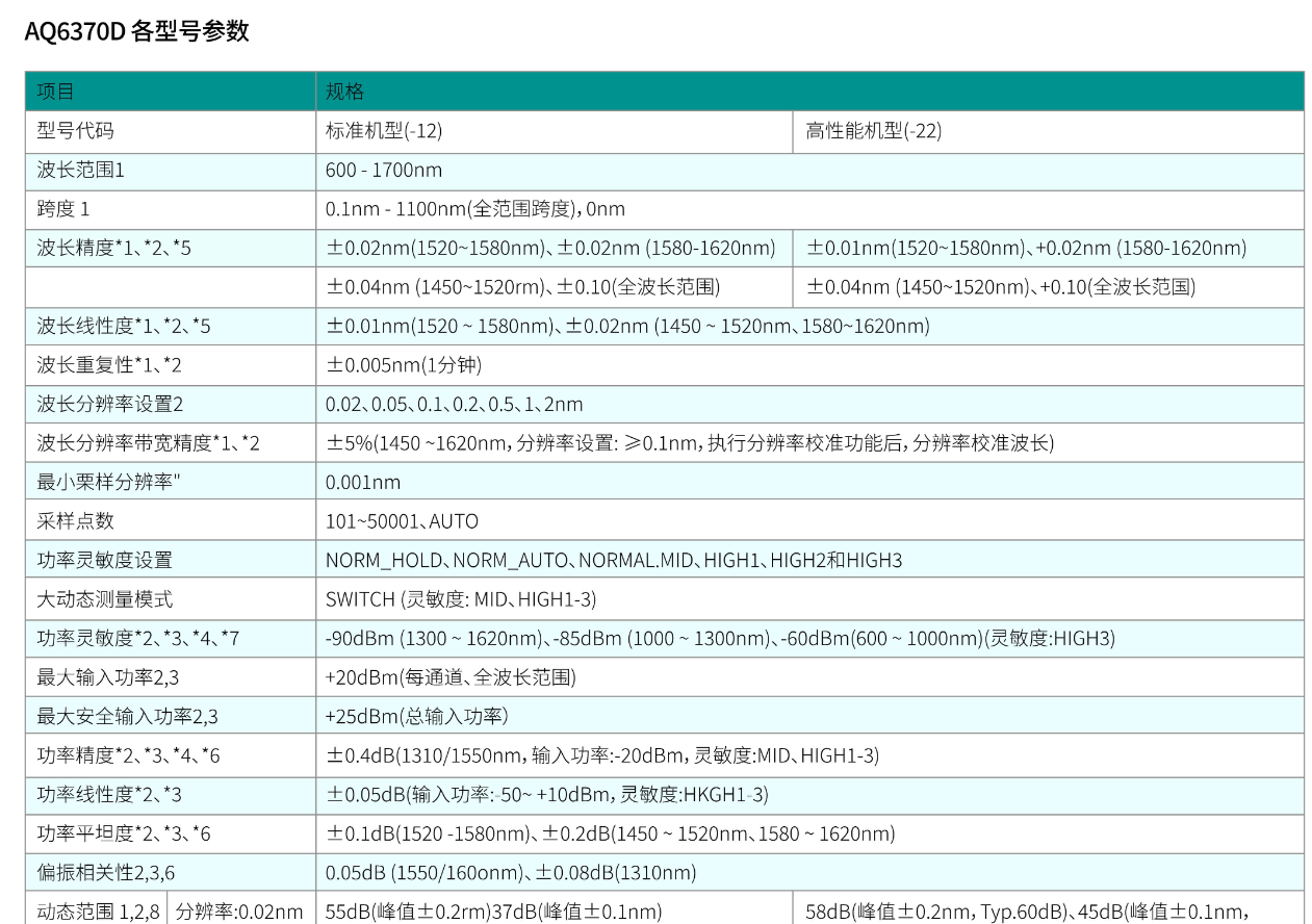 这些规格展示了AQ6370D光谱分析仪在光学性能方面的世界一流水平,特别是在波长精度、分辨率和动态范围方面的高要求。