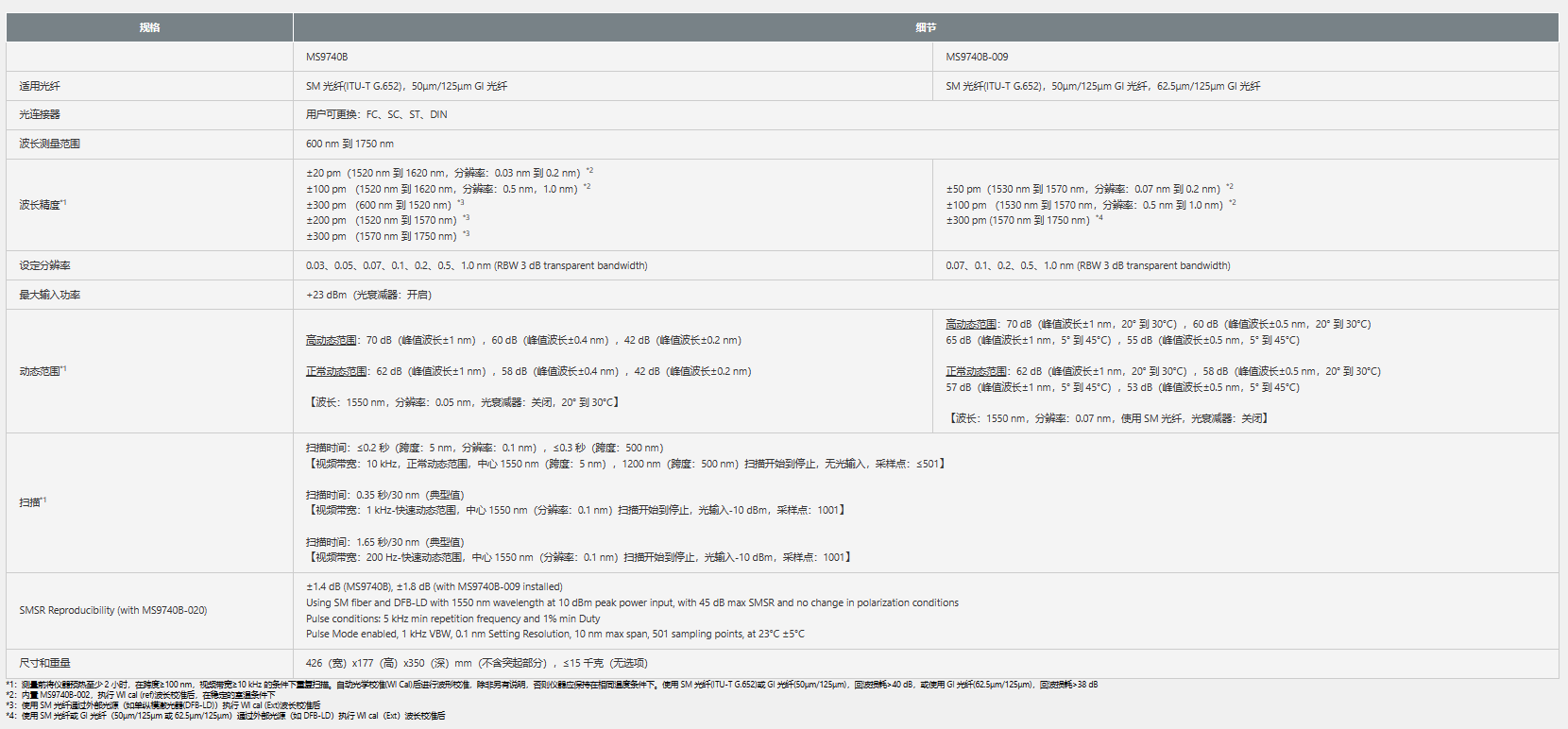 分辨率:MS9740B的分辨率为0.05nm,在1550nm波长下,且在光衰减关闭(Att: Off)的情况下,在20~30℃的温度条件下测量得到。这一分辨率的提高意味着MS9740B能够更精确地测量光谱中的细微差异,对于需要高精度测量的应用场景尤为重要。