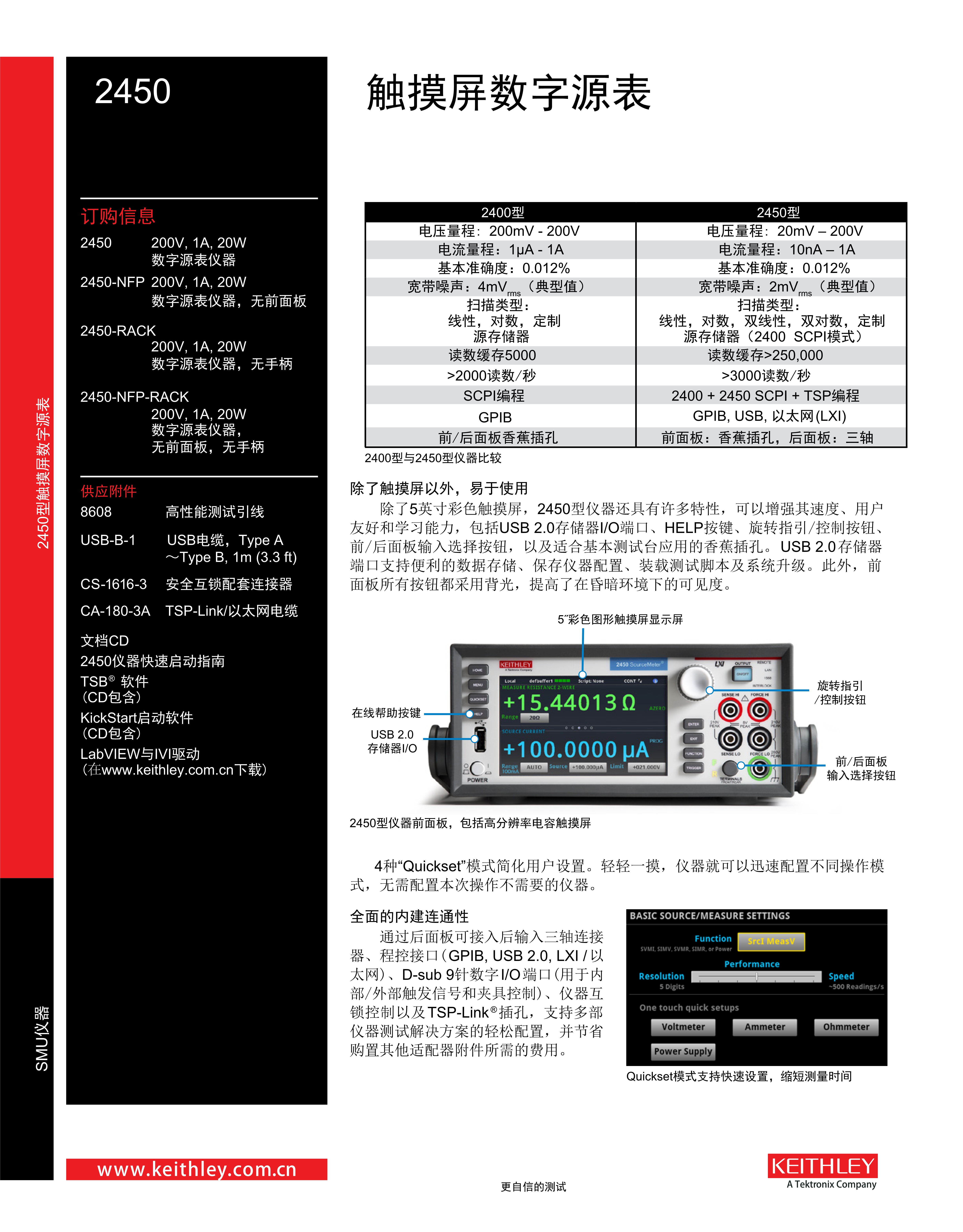吉时利2450数字源表的市场定位主要是面向需要进行电流、电压和电阻测试的专业人士,如工程师和科学家。这款设备采用了先进的电容式触摸屏技术和图形用户界面(GUI),旨在简化操作流程,减少学习曲线,使用户能够更快地掌握使用技巧并提高工作效率。