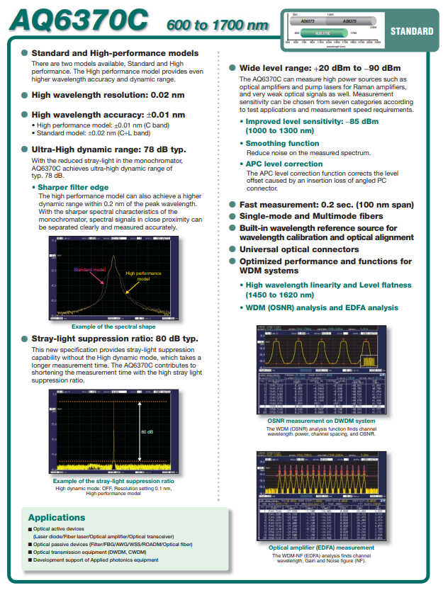 AQ6370C是一款功能强大、测量速度快、精度高的光谱分析仪,适用于光通信设备和器件的光学特性测量,以及光纤激光器等高功率光源的测试。