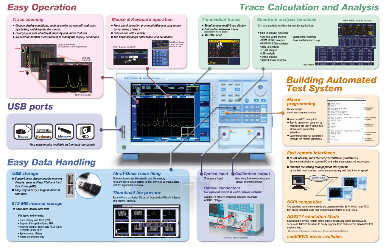 YOKOGAWA AQ6370C是一款高性能的光谱分析仪,具有世界一流的光学性能。它的波长范围为600至1700nm,能够提供高波长精度±0.01nm和高波长分辨率0.02nm。此外,AQ6370C具备大动态范围78dB(典型值)和宽功率量程+20~-90dBm,使其能够快速测量并处理各种光源。