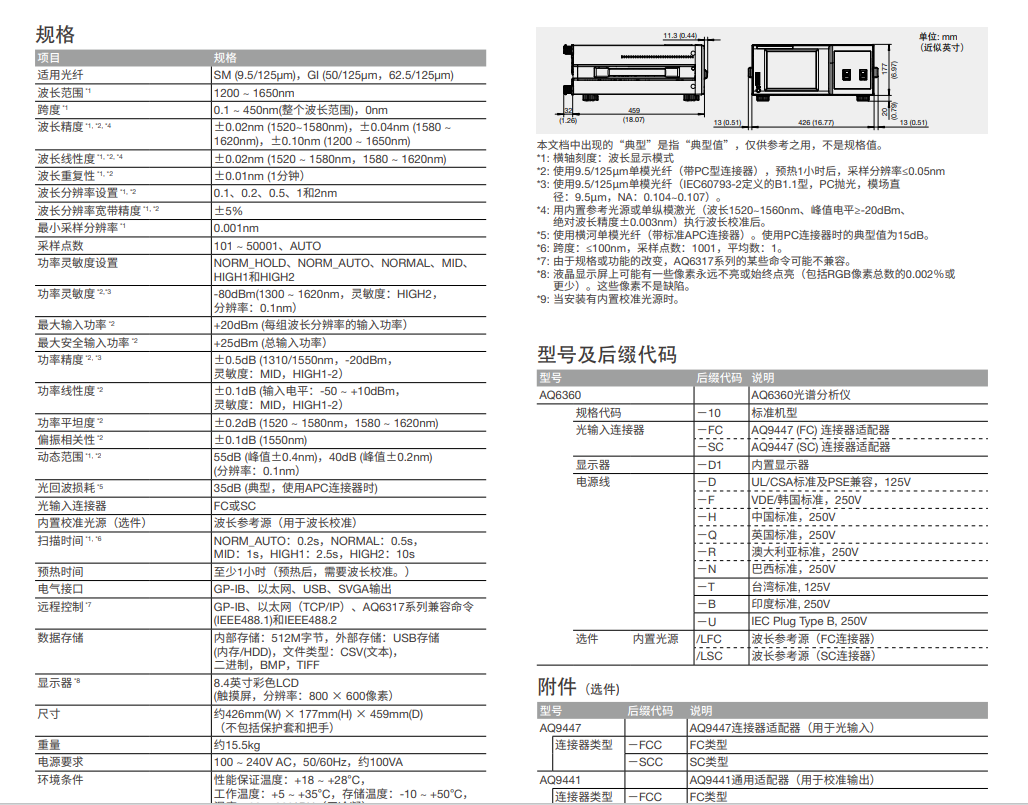 AQ6360是一款由日本横河(YOKOGAWA)生产的光谱分析仪,其主要技术参数包括波长范围、波长精度和波长线性度等。AQ6360的波长范围为1200~1650nm ,具有较高的波长精度,在1520~1580nm范围内为±0.02nm,在1580~1620nm范围内为±0.04nm,在1200~1650nm范围内为±0.10nm。此外,AQ6360还具备高动态范围,达到55dB。
