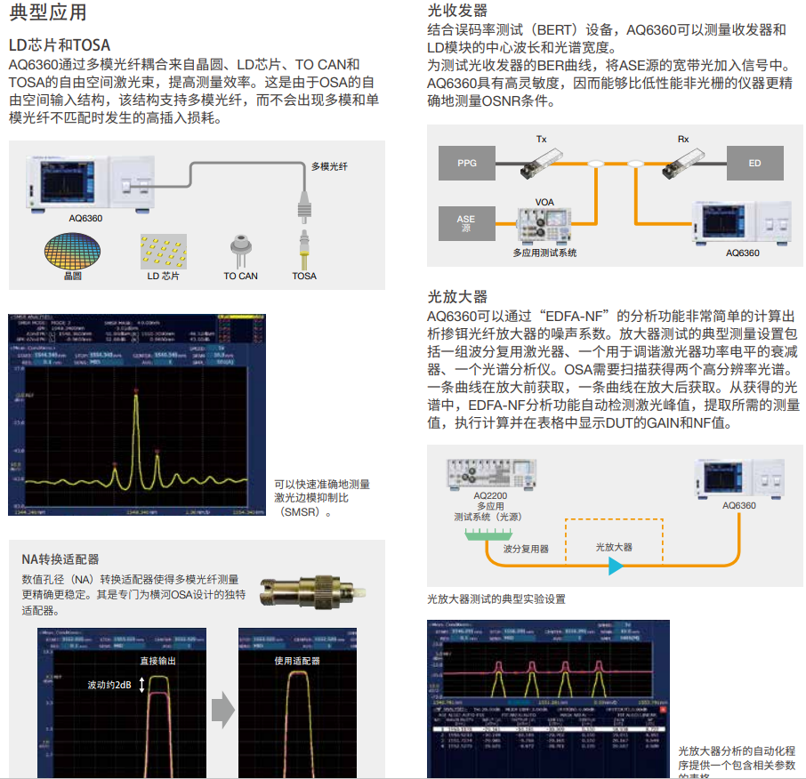 适用场景:AQ6360主要针对数据通信和电信设备的生产测试,如激光二极管、光收发器和光放大器等。这一点与某些其他型号的设计初衷可能有所不同,后者可能更多地面向研发目的。