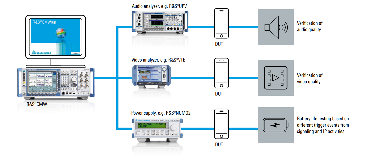 终端测试:CMW 500支持市场上几乎所有的通信标准的终端测试,包括但不限于GSM、GPRS、EDGE、EDGE Evolution、Mobile WiMAX™、LTE FDD/TDD、TD-SCDMA、WCDMA/HSDPA、HSPA+、CDMA2000、GPS、WiFi、Bluetooth等。