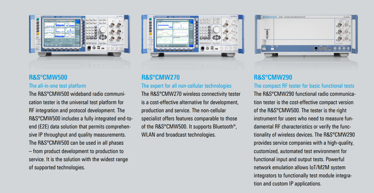 高级测量能力:CMW 500具备多项高级测量能力,例如MIMO和MF-TDMA测试、多信道测试、NB-IoT和物联网(IoT)等方面的测试。它还支持各种测试配置和测试用例,包括多单元测试、并行测试、评估模式测试和差分测量测试。