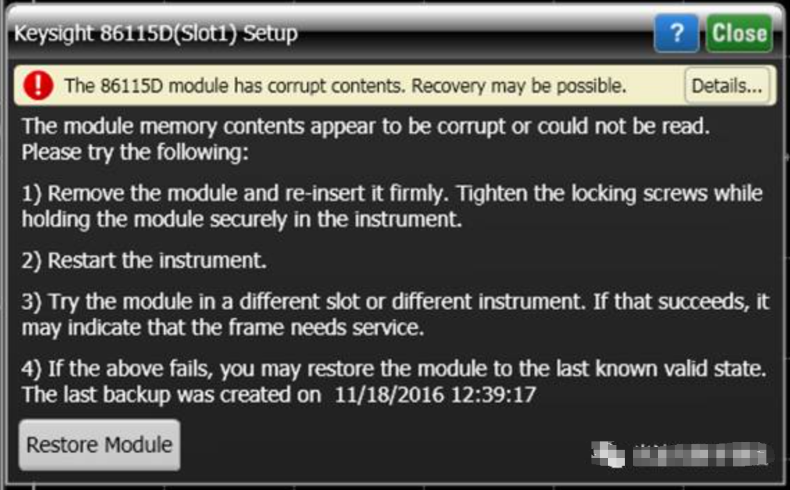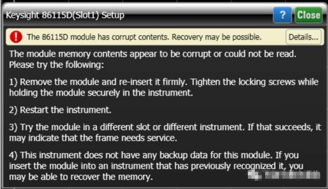 Keysight 86100D主机所搭配使用的模块在使用过程中可能会由于模块没连接好造成模块和主机的通信中断,从而会导致模块的系统数据丢失,一旦模块数据丢失,主机会提示“module memory corruption”,发生该问题后我们通常需要将该模块送至是德科技服务中心进行模块的初始化和校准来恢复该模块数据。