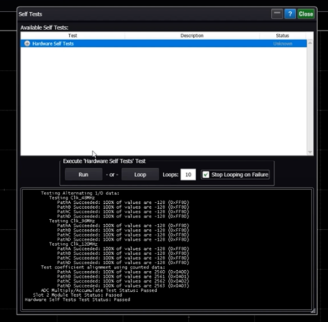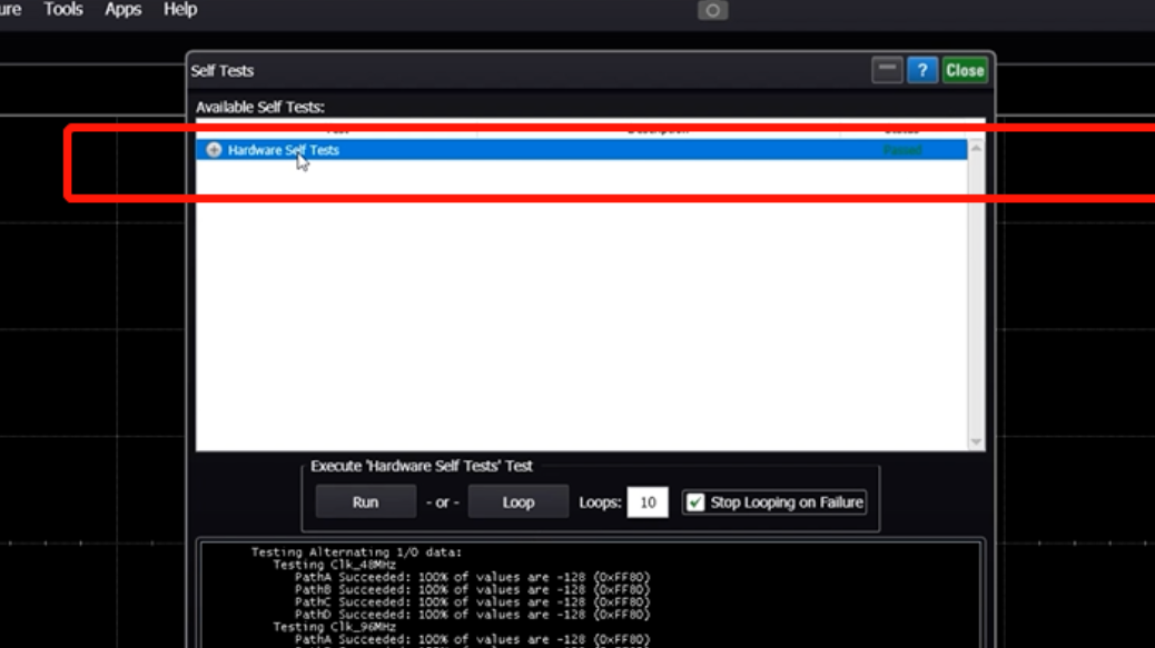 为了确保仪器正常工作,我们可以在Tools菜单下进行硬件自检。选中当前模块并点击运行,系统会提示前面板上的指示灯颜色变化,以完成不同的测试项目。