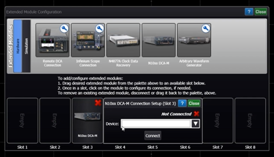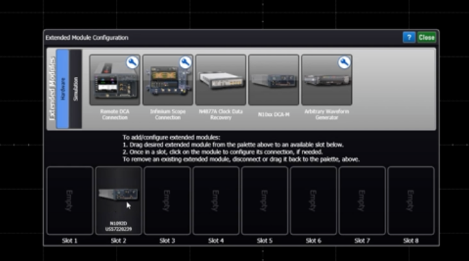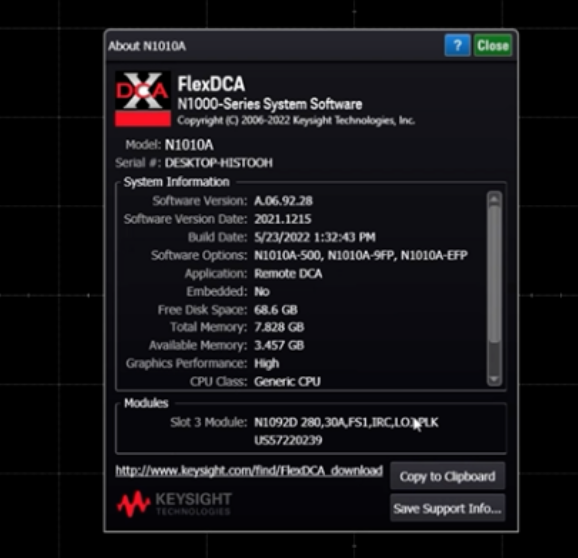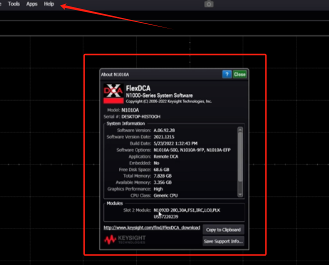 在PC端打开是德科技DCA-M示波器的应用程序后,如果有新的模块加入,程序界面左下角会出现弹窗通知。您还可以通过界面上方的“help”按钮查看模块信息,例如本次介绍的N1092D的选件和序列号等。