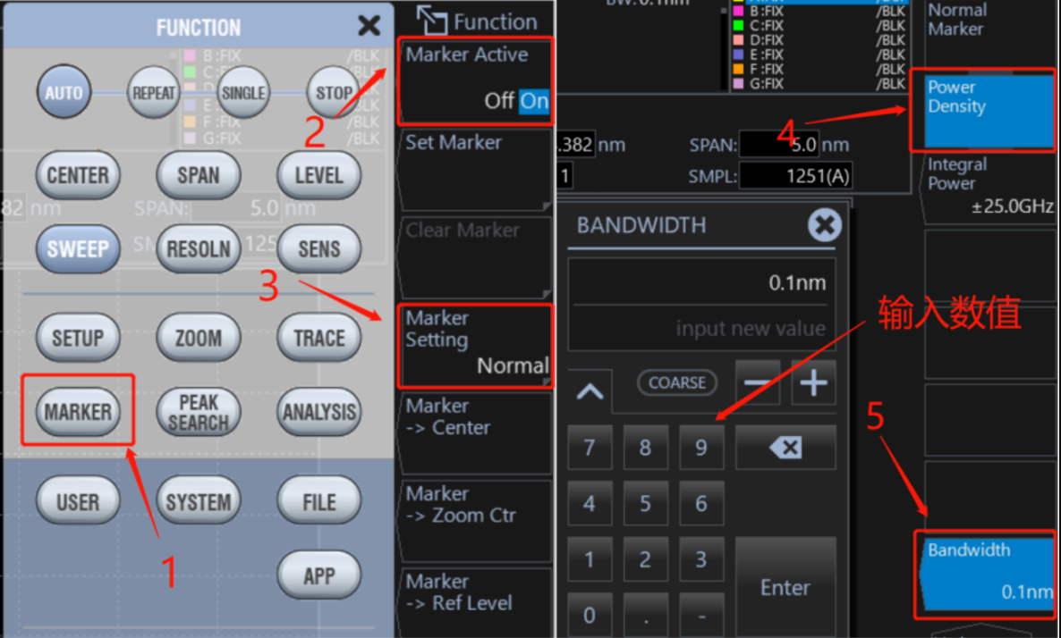 积分功率标记是以波形上的标记位置为中心,把指定频率范围的积分功率值显示到数据区域的一项功能。在使用者调制光的光谱计算信号功率的情况下,可用此功能计算扩散光谱的积分功率。