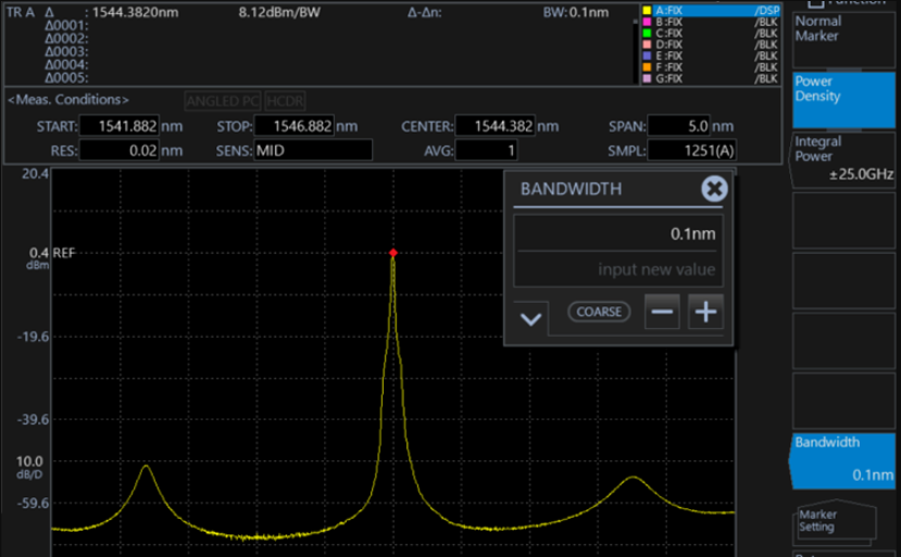 功率谱密度标记是以波形上的标记位置为中心,把每个在0.1nm ~ 10.0nm归一化带宽设置范围内的功率值显示到数据区域的一项功能。测量信号噪声功率的情况下,使用者便可采用这些标记计算出每个既定带宽所对应的功率值。