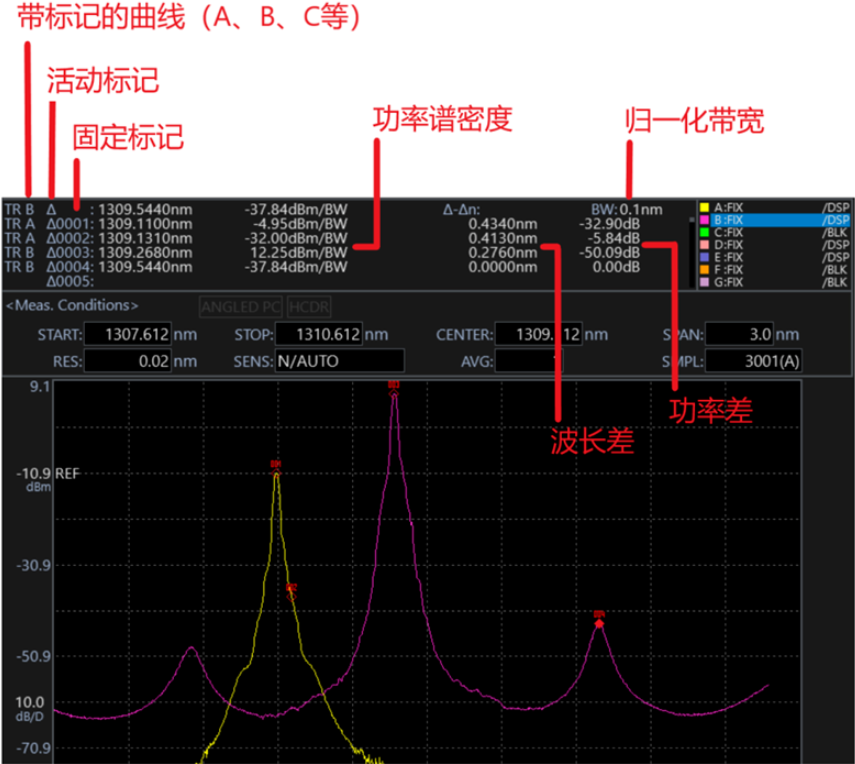 ▲光谱仪同时在多条曲线上设置多个功率谱密度标记的示意图