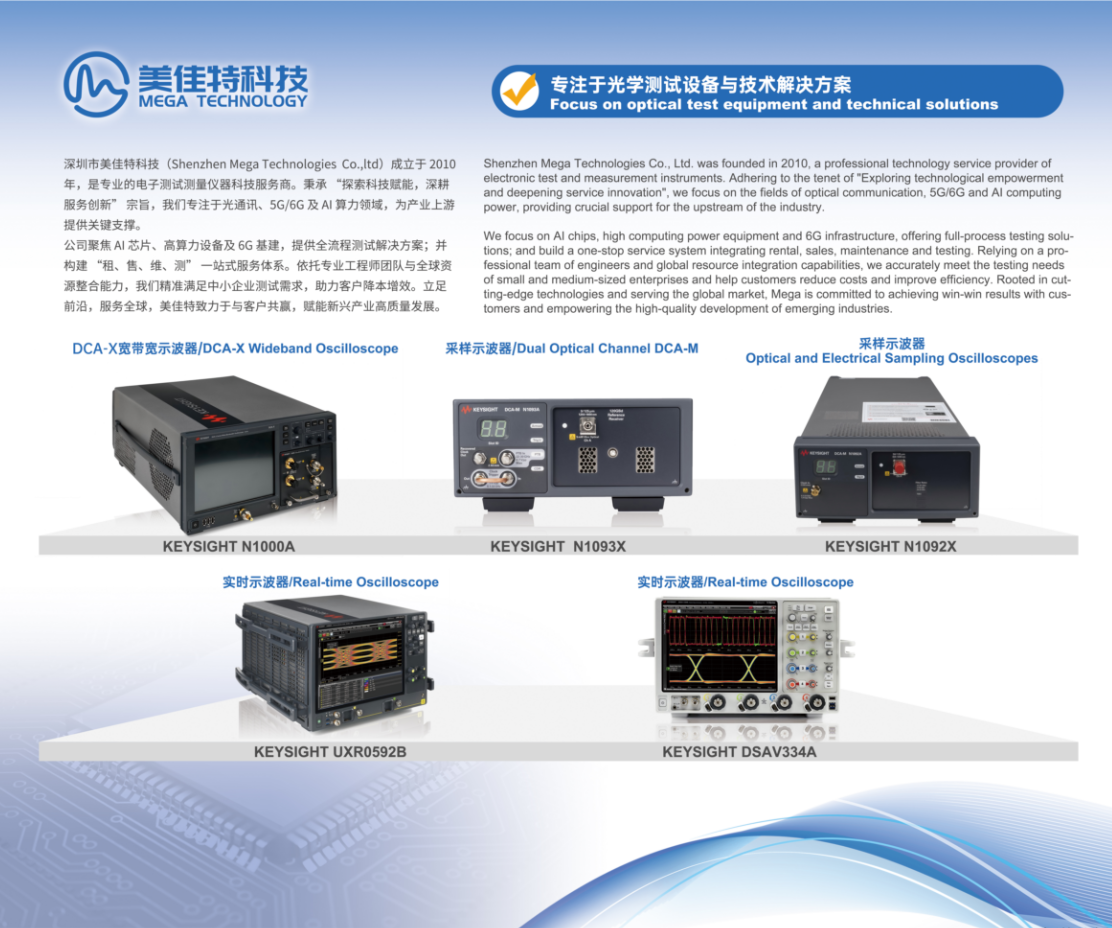 成立于 2010 年,美佳特科技始终专注于光通信、5G/6G 及 AI 算力领域,是国内领先的电子测试测量仪器技术服务商。我们以 “技术赋能、服务深耕” 为理念,围绕光芯片、光模块等核心环节,为客户提供覆盖 “租、售、修、测” 的一站式服务体系。凭借专业的技术团队与快速响应能力,我们已成为众多中小微企业及科研机构的可靠伙伴,助力新兴产业高质量发展。