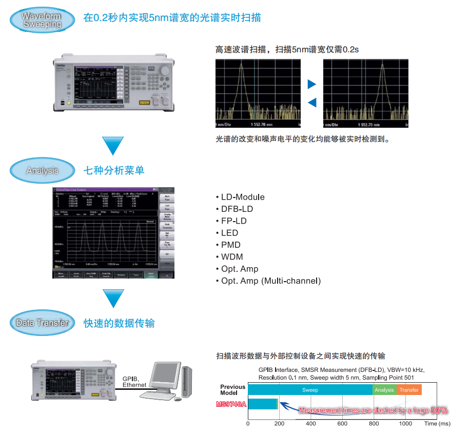 Anritsu MS9740A减少了从波形扫描到数据传输到外部控制设备的总时间,并支持简单的分析程序。流程,提供出色的性价比和更好的生产力