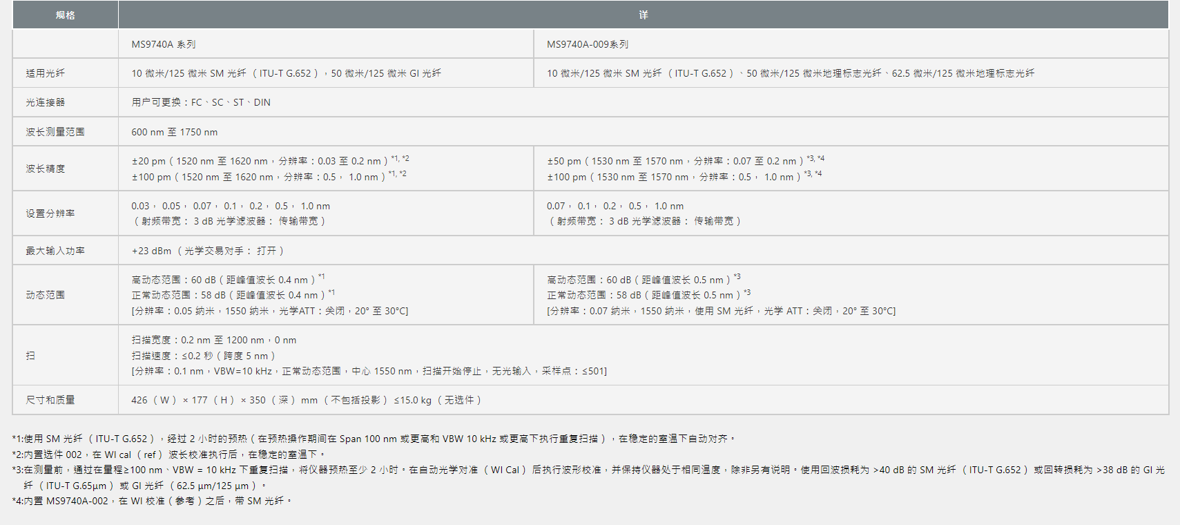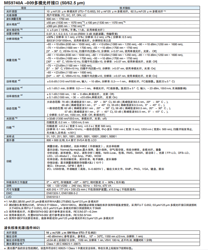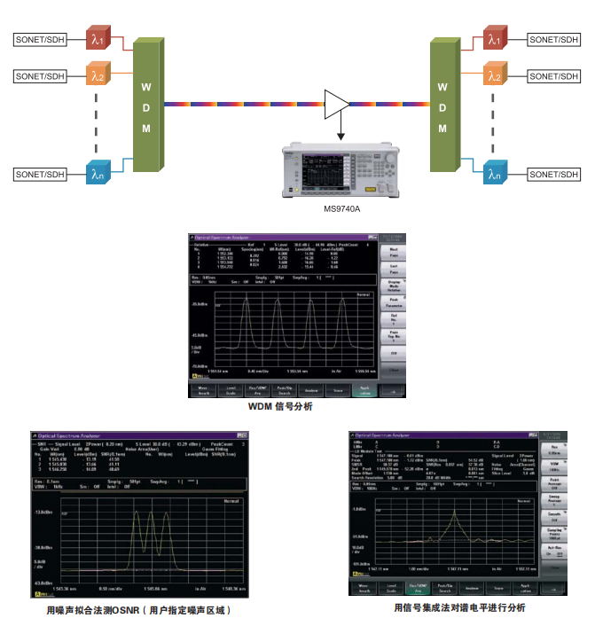 MS9740A在距峰值波长0.2nm外42dB的动态范围保证了100GH7和50GH7间隔WDM信号的精确测量。MS9740A最多可分析300个信道的信号,所有WDM 信号分析需要的信息如中心波长、功率、OSNR等都可以显示在同一界面上。由于具有详细的噪声位置选择,所以当作OSNR分析时,可以选择两种估算方法:两点插入法和噪声拟合插入法,两点法可以自动分析Dip点,但是到中心波长的距离可以人为指定。